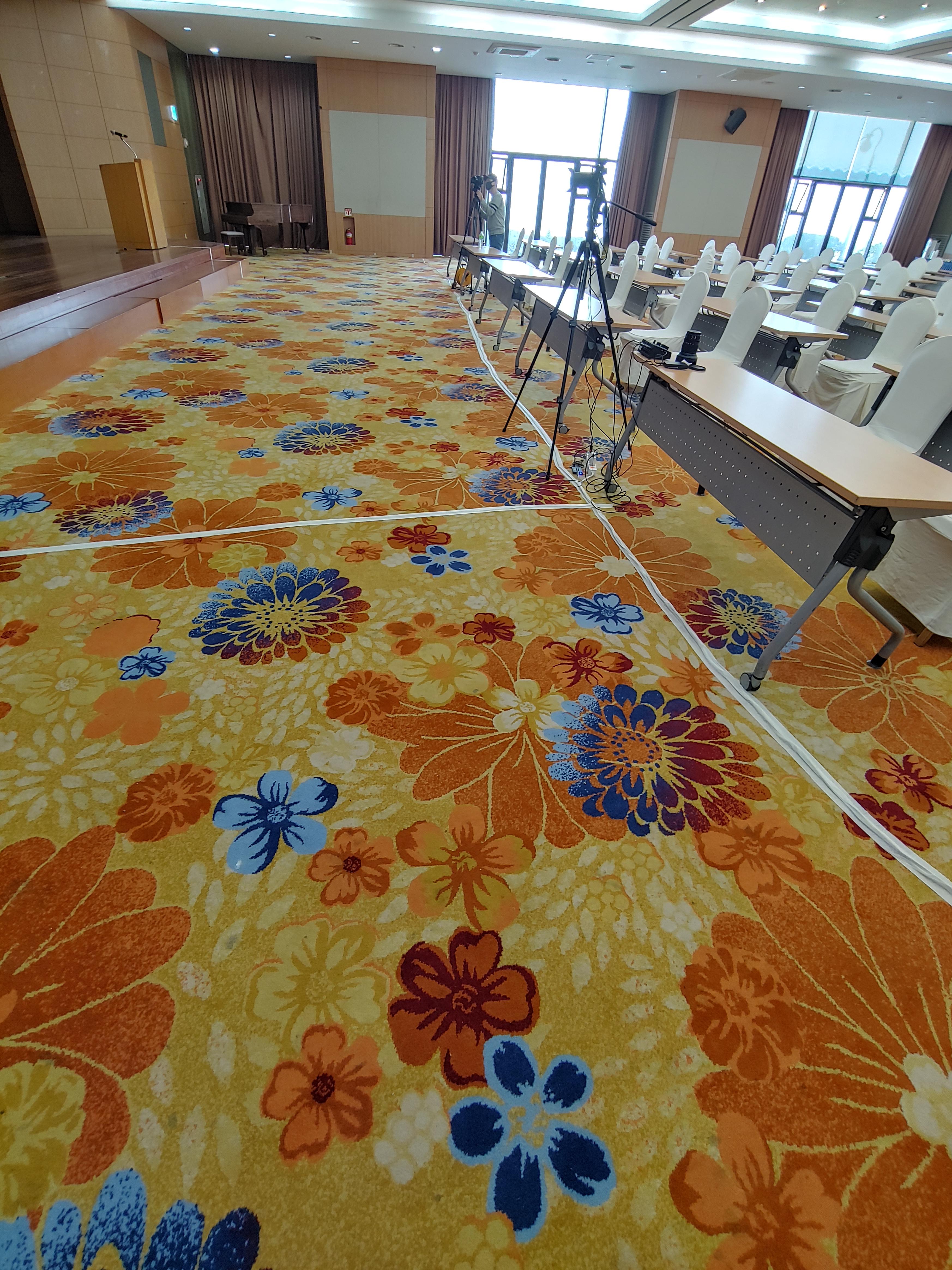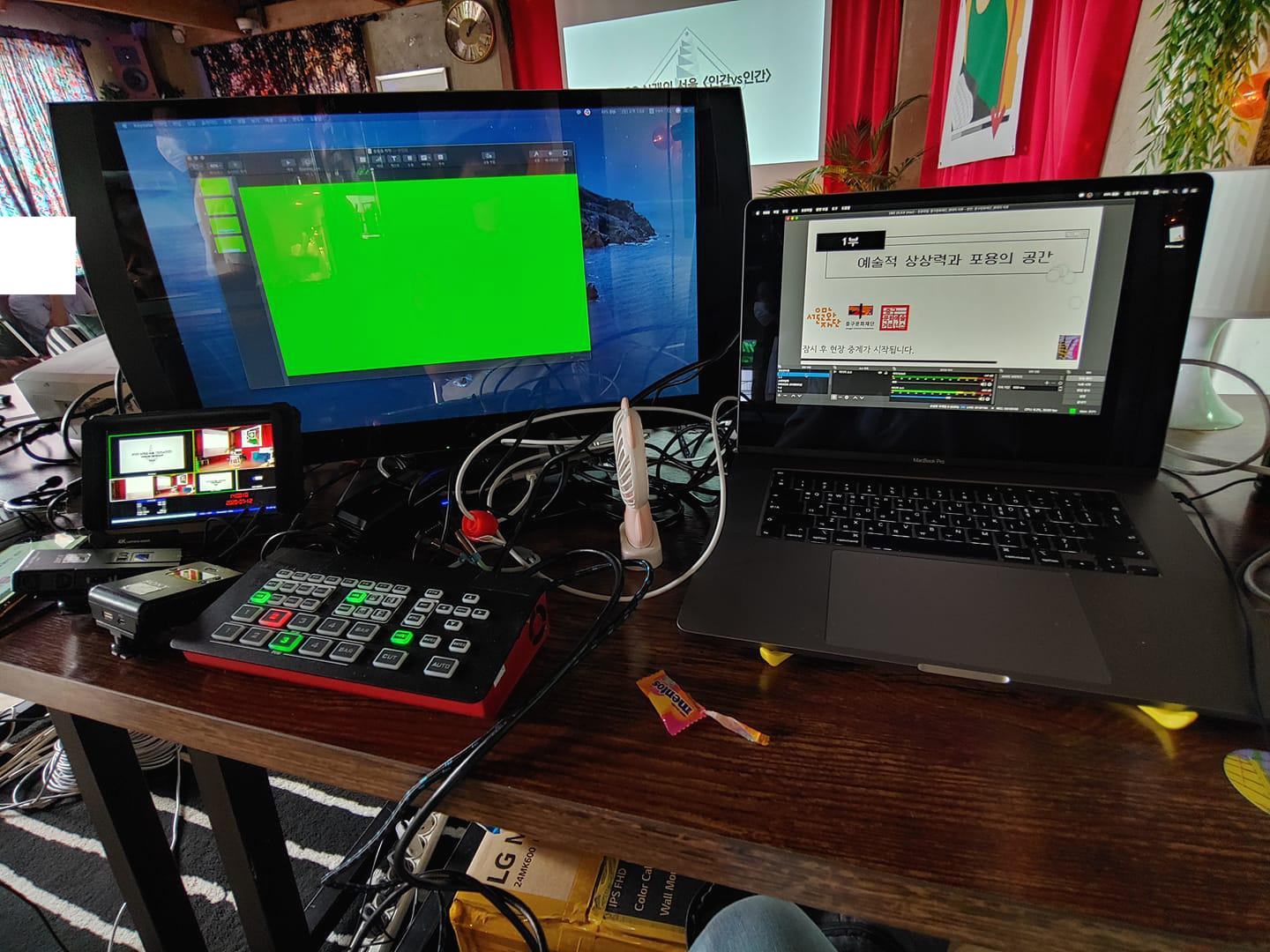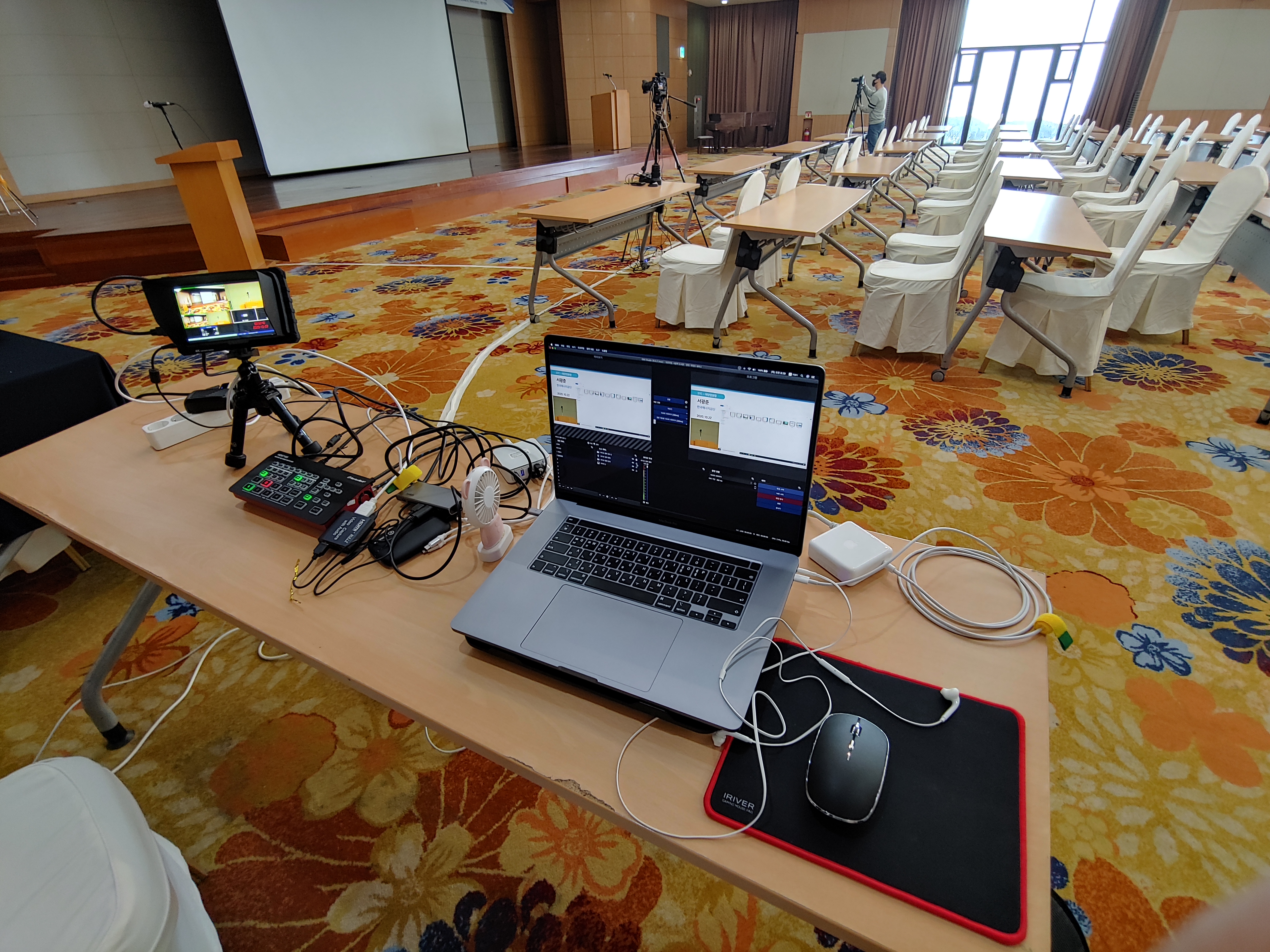 카메라 3대에 카메라감독님 두 분 그리고 송출 운영과 컷스위칭은 제가 직접 담당했습니다. 카메라가 3대이다 보니 각종 케이블이 바닥으로 이어져 있게 됩니다. 송출 테스트를 마친 후 전부 테이핑 처리를 해줍니다. 그래야 혹시나 이동하는 경우에도 케이블에 걸려 넘어지는 사고를 방지할 수 있기 때문입니다.