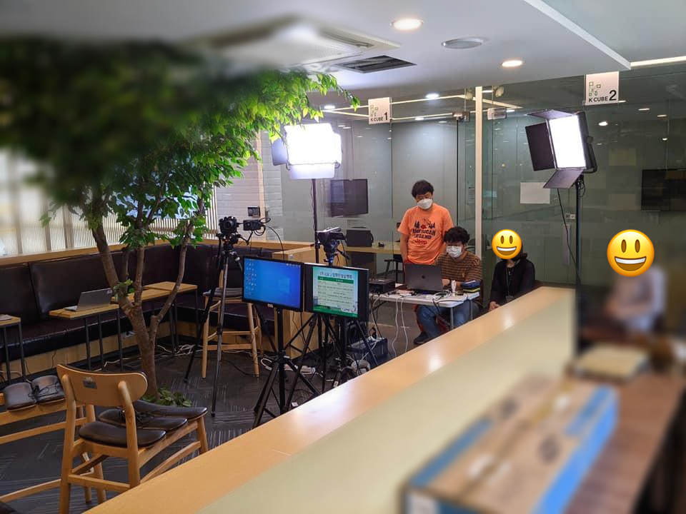 강의 규모 자체는 크지 않습니다만 온라인 송출에서 문제가 발생할 경우 바로 대체송출이 가능하도록 실시간 백업용 송출을 포함해 총 3개 채널로 동시 송출을 해야하는 중계 현장입니다. 규모가 작다고 해서 마냥 간단하지만은 않을 수도 있습니다. ^^  실시간 강의 후엔 실시간 질문 답변 시간이 있는데요. 시청자들이 보내온 질문을 자막으로 입혀 화면에 띄우고 해당 문의사항에 대해 강의자가 현장에서 바로 답변을 주는 방식의 강연입니다.