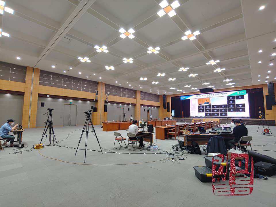 사내 인트라넷의 화상회의 시스템을 활용한 행사 중계였습니다. 사내망의 화면과 음성을 현장과 유튜브로 동시에 중계하는 작업이었습니다. 케미필름은 현장 세팅과 송출 업무를 진행했습니다.
