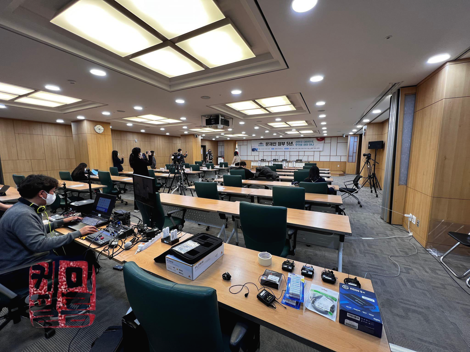 위 현장은 중회의실의 모습입니다. 중간에 지상파 ENG팀이 들어와서 약간의 마찰(?)이 있었습니다만 잘 수습하고 문제없이 진행했습니다. 국회 행사의 경우 지상파 팀이나 국회방송 팀이 혹시라도 들어오게 된다면 사전에 정보를 확인해두는 편이 좋습니다. 행사당시 인터넷 연결이 불량해 혹시모를 사태를 대비하기 위해 인터넷 중계용 본딩라우터기를 사용했습니다.