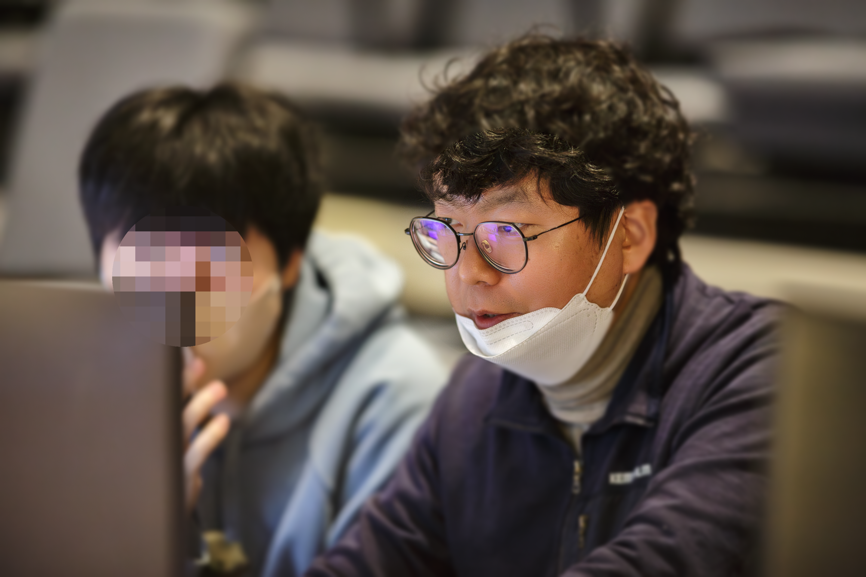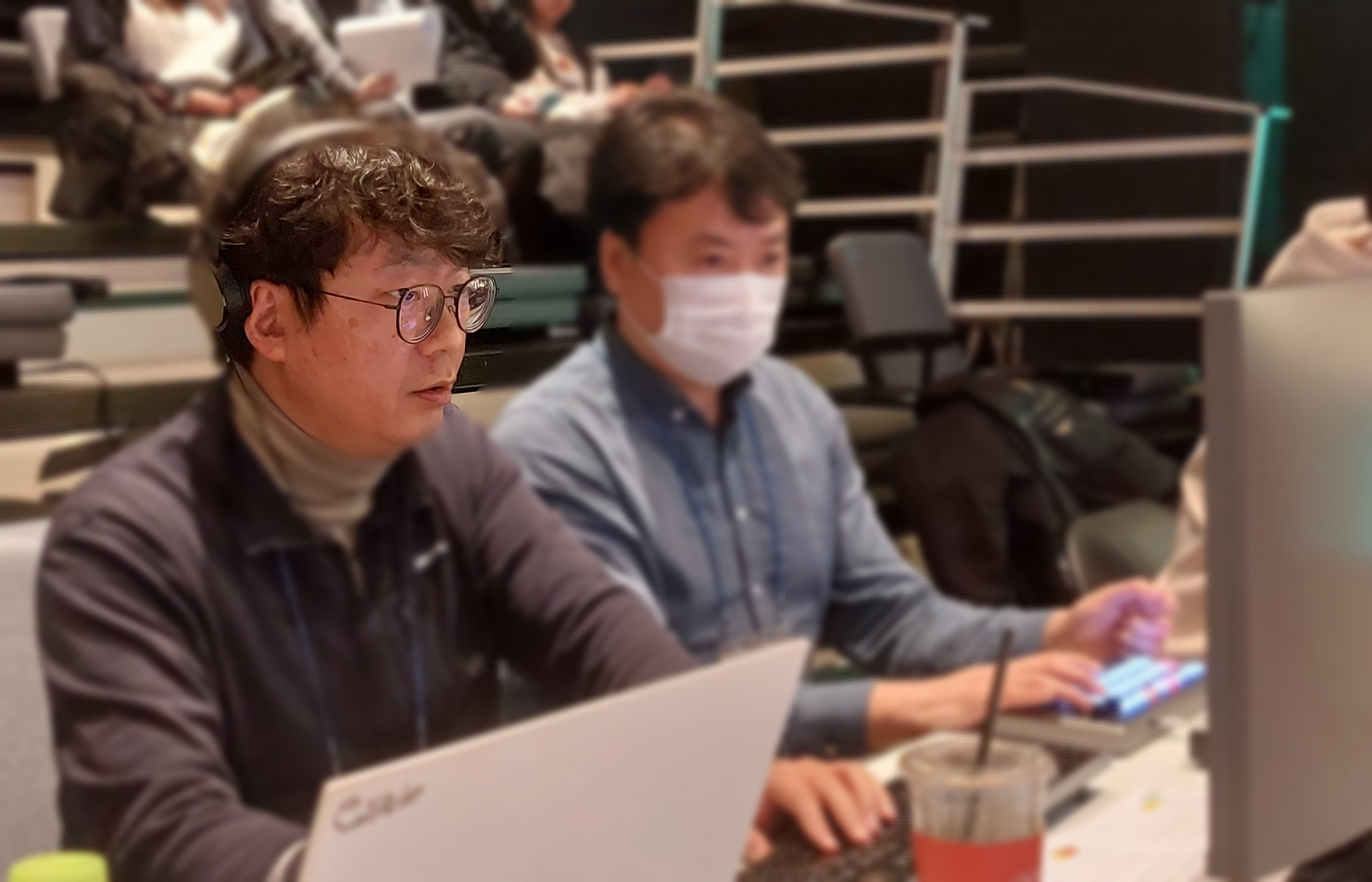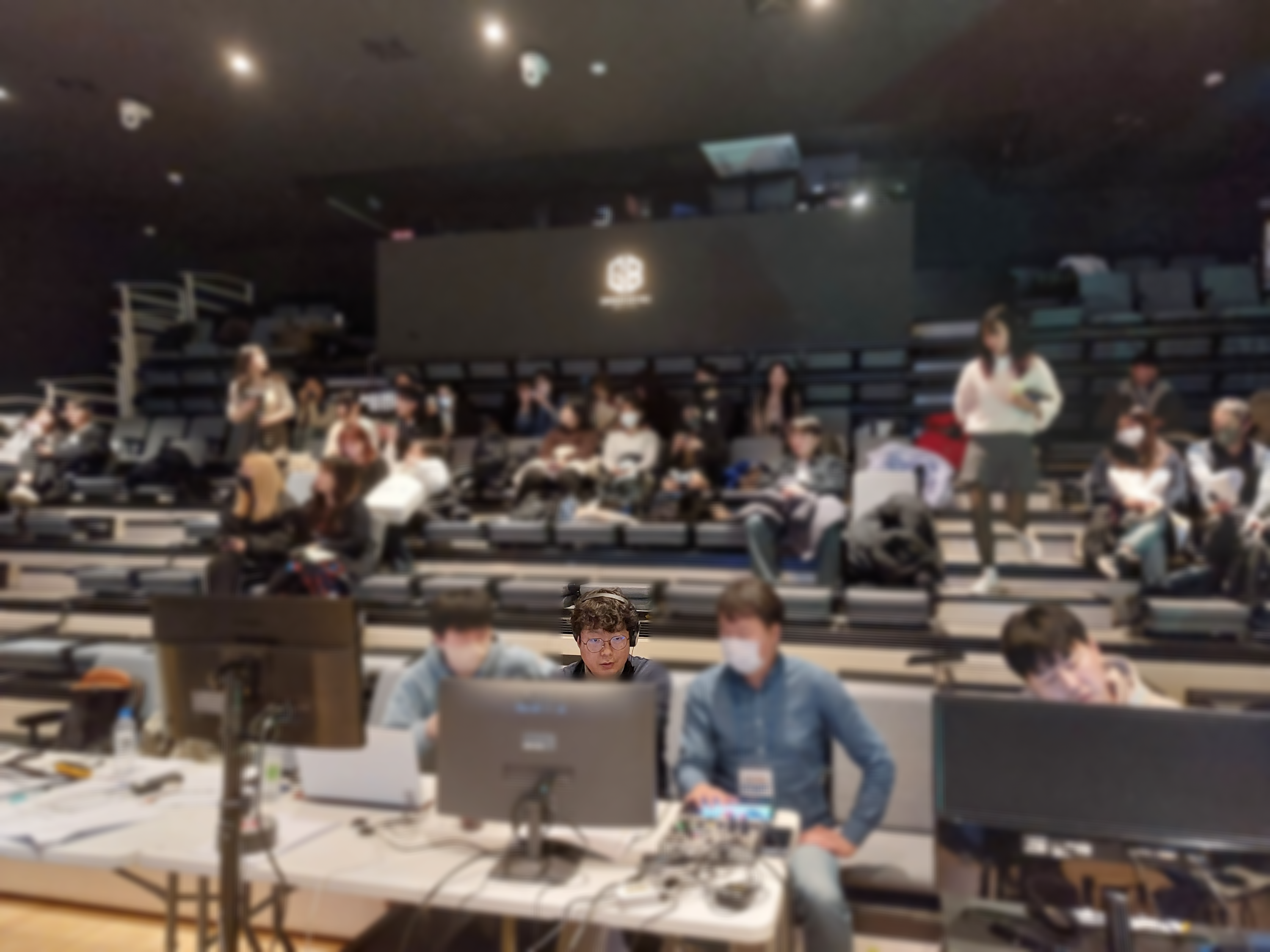 중계석에 앉아 이것 저것 테스트 중인 접니다. 사진상 왼쪽 옆에 계신 피디님과 붙어 앉아 준비 과정부터 라이브 송출 내내 밀담(?)을 나눴습니다. 사진상 제 오른쪽에 계신 감독님과는 컷 스위칭에 대해 실시간 밀담(?)을 나눴습니다.