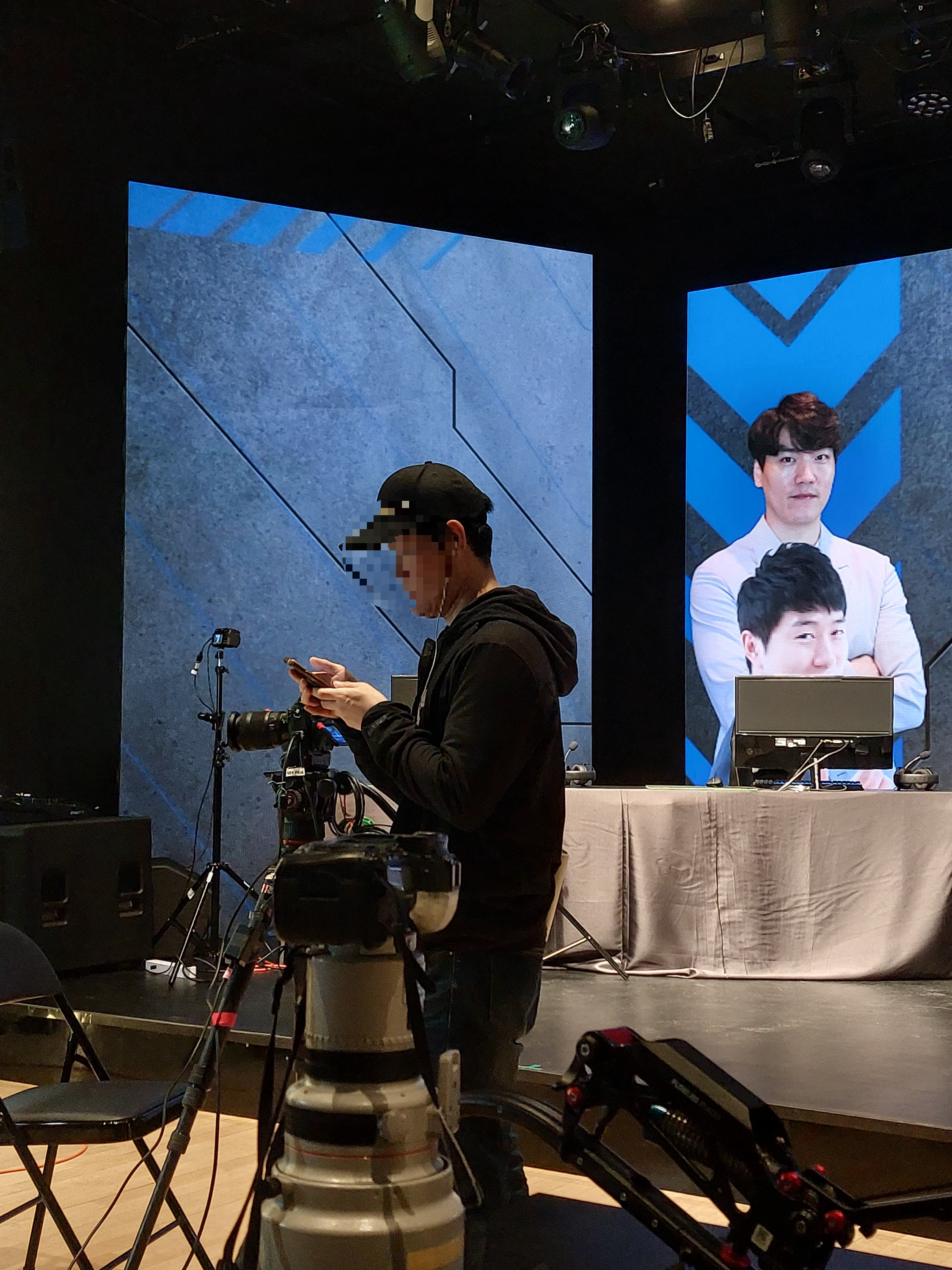 중계석에 앉아 이것 저것 테스트 중인 접니다. 사진상 왼쪽 옆에 계신 피디님과 붙어 앉아 준비 과정부터 라이브 송출 내내 밀담(?)을 나눴습니다. 사진상 제 오른쪽에 계신 감독님과는 컷 스위칭에 대해 실시간 밀담(?)을 나눴습니다.